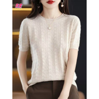 五分袖针织打底衫女圆领套头宽松半袖体恤上衣镂空钩花中袖毛衫新