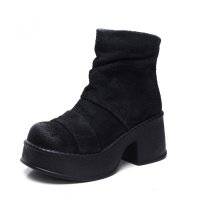短靴女秋冬复古风个性时装靴毛毛口坡跟磨砂皮靴软底加绒棉鞋