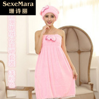 珊诗丽抹胸珊瑚蝴绒蝶结可爱公主性感裹胸浴裙干发浴帽套装女睡衣裙浴巾