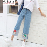 卡通印花牛仔裤原宿风宽松卷边阔腿裤九分裤潮