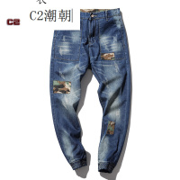C2潮朝夏冬春春季牛仔裤男日系宽松小脚裤束脚哈伦裤乞丐裤青年长裤蓝色