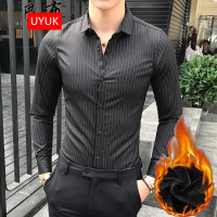 UYUK男士加绒衬衫2017冬季新款英伦加厚保暖衬衣男长袖商务条纹寸衫潮