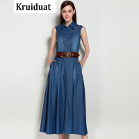 Kruidvat欧美2017春夏无袖翻领腰带大摆长款修身牛仔裙MY蓝色