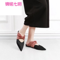 锦铭七玥2018春季欧美平底拖鞋尖头毛毛鞋时尚绸缎半拖鞋百搭粗跟女鞋潮