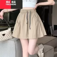 YIBUSHENG卡其色速干短裤女季抽绳高腰宽松五分阔腿裤子小个子A字休闲裤