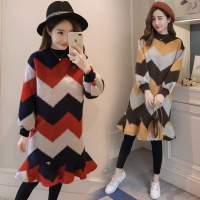 薇侣2017新款孕妇荷叶边毛呢加绒宽松中长款泡泡袖外出哺乳连衣裙