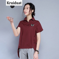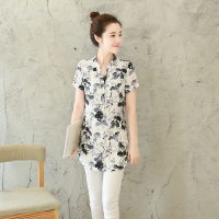 莞馨印花修身翻领短袖韩版显瘦甜美衬衫中长款2016年夏季衬衫