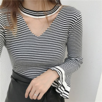 珂依舍2017秋装新款实价袖口特别设计喇叭袖条纹修身针织衫小性感v领上衣