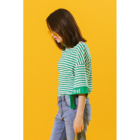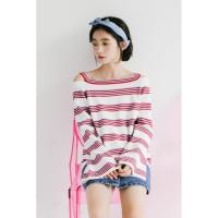 蜜妃儿夏装新款女韩版潮七分袖条纹t恤女宽松挂脖上衣体恤衫