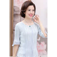 中老年女装喇叭袖雪纺上衣女夏修身中袖条纹雪纺衫时尚小衫女显瘦