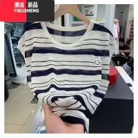 YIBUSHENG冰丝针织短袖条纹正肩t恤女2024新款季小个子v领小飞袖无袖上衣