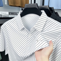 无痕高弹短袖衬衫男夏季新款商务休闲条纹薄款翻领印花中年衬衣男