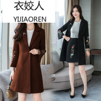 衣姣人女装套装裙女冬季2018新款中长款绣花毛呢外套时尚半身裙两件套装