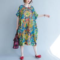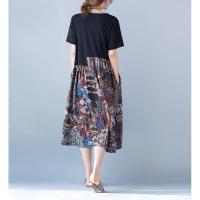 文艺范原创女装拼接宽松大码中长款棉麻连衣裙夏胖mm短袖休闲长裙