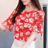 薇侣2017实拍碎花雪纺衫短袖新款大码女装韩版时尚喇叭袖上衣小衫