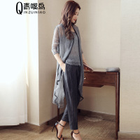 步来褶惠2017夏季圆领T恤+条纹阔腿裤三件套套装外套女韩版拼接夏