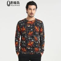 尊首新款2017男士打底衫中国风马图案印花针织衫秋冬时尚圆领套头潮流毛衣黑色
