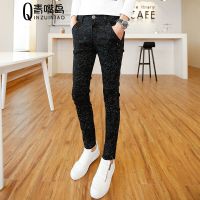 尊首新款2017春装新款男士韩版休闲裤点点图案修身型花裤子男时尚潮流小脚长裤黑色