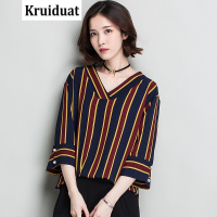 薇侣2017新品夏季新款韩版宽松竖条纹衬衣女七分袖V领雪纺衬衫打底上衣