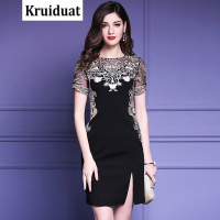 Kruidvat优雅气质前开叉金线刺绣修身包臀连衣裙女夏2017新款M032黑色