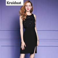 Kruidvat优雅气质钉珠鸵鸟毛高腰连衣裙女夏2017新款黑色