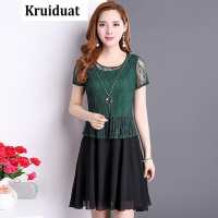 Kruidvat短袖雪纺连衣裙女夏季2017新款修身镂空假两件