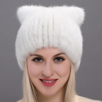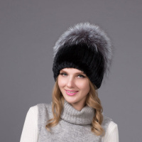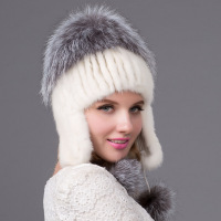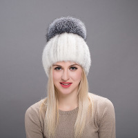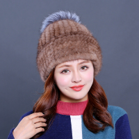 水貂帽子女冬季新款真皮草帽子狐狸毛球拼色韩版毛线帽貂皮帽加厚卡其色均码(帽网有弹性)