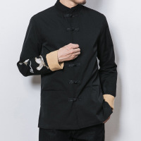 UYUK 秋冬季中国风长袖男唐装刺绣青年复古盘扣中袖衬衫修身中式上衣黑色