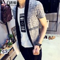 尊首新款2017青少年学生修身假两件短袖T恤英伦风男士针织开衫外套上衣夏