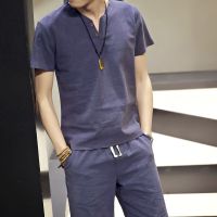 默蒂梵夏季唐装男短袖蚕丝套装中年休闲民族服装中国风蚕丝汉服