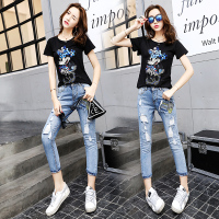 莞馨套装莞馨套裙2017年夏季磨白口袋牛仔裤+卡通图案短袖圆领上衣