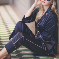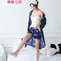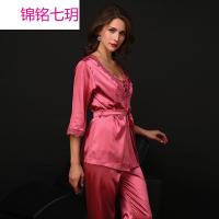 锦铭七玥春秋长款性感仿真丝绸缎印花三件套中袖睡衣舒适冰丝居服女