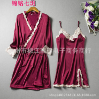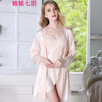 锦铭七玥睡衣女 仿真丝性感夏季 睡裙两件套长袖睡袍 吊带裙蕾丝花边