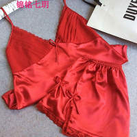 锦铭七玥新品夏女士大红丝绸吊带短裤睡衣两件套装性感丝居服