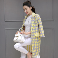 莞馨(wanxin)2016秋冬千鸟格中长款毛呢西装外套韩版修身喇叭袖毛呢大衣外套女