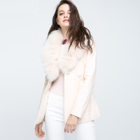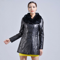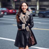 新款绵羊皮皮衣 女 休闲保暖獭兔领中长款双排扣口袋真皮皮衣