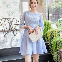 珂依舍2017秋装新款2017秋季新款韩版女装七分袖连衣裙斜纹甜美中裙荷叶边