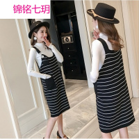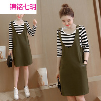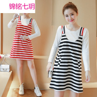 锦铭七玥018新春孕妇装韩版中长条纹T恤长袖两件套背带孕妇连衣裙