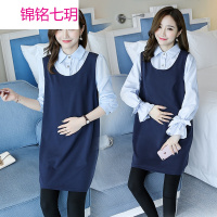 锦铭七玥孕妇装2017秋季韩版新品背带孕妇连衣裙 时尚长袖孕妇衬衫两件套