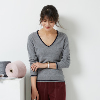 秋冬新品薄款大V领山羊绒衫女式拼色针织衫套头毛衣羊毛衫打底衫