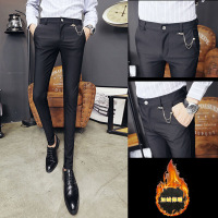 UYUK秋冬季韩版男生弹力小脚裤修身青年显瘦加绒小西裤潮流紧身发型师裤子黑色