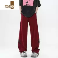 YANXU美式hiphop冰丝裤子男士秋季高街速干侧条纹休闲裤酒红色直筒长裤