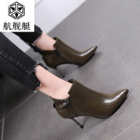 金属链细跟高跟鞋女马丁靴2017秋冬新款加绒短靴中高跟尖头及裸靴
