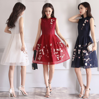 莞馨绣花纯色立领复古无袖中长款显瘦修身优雅甜美连衣裙2017年夏