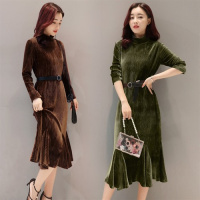 莞馨2017秋季新品圆领长袖纯色百褶裙 新 韩版连衣裙