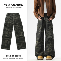 高街 vibe 风迷彩牛仔裤 男款宽松阔腿多口袋工装牛仔长裤潮 休闲