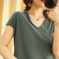 2026新款棉麻纯色T恤女v领短袖宽松显瘦休闲短袖针织衫上衣女装夏