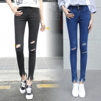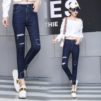 普美思 2017秋冬女装新款韩版潮流破洞牛仔裤女修身显瘦小脚铅笔裤女