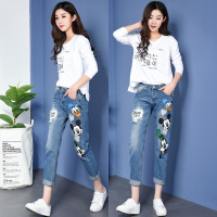 珂依舍2017秋装实拍破洞牛仔裤女韩版宽松卡通米奇小脚乞丐垮裤九分哈伦裤