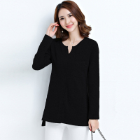 大码女装打底衫2017秋装新品韩版V领中长款拼接雪纺长袖T恤女上衣